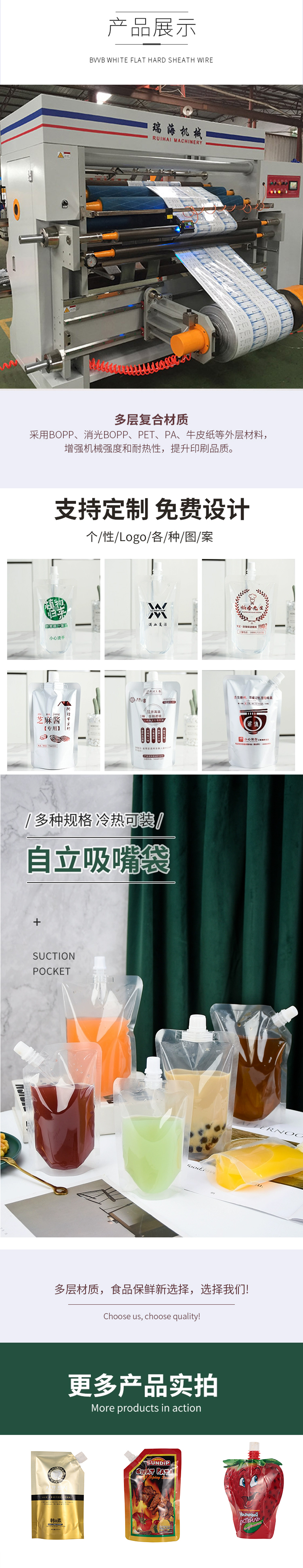 产品的样式:我司有吸嘴包装袋 不规则异型包装袋 吸嘴自立包装袋 液体吸嘴包装带 中封包装袋、拉链袋等可选