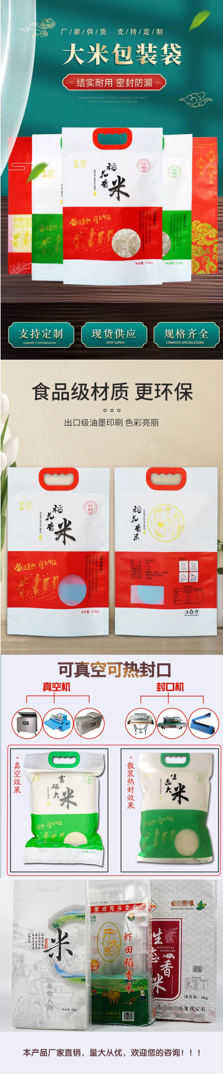 4.我司改进传统的生产工艺,使用哑光膜编织大米袋,具有以下优点:(1)防潮性:有很好的防潮性,可以有效地保护大米免受潮湿和水分的影响,从而保持大米的品质和口感。(2)耐高温:可以承受高温,可以在高温下进行杀菌处理,保证大米的卫生质量。(3)包装袋质感:具有较高的质感,可以提高产品档次。