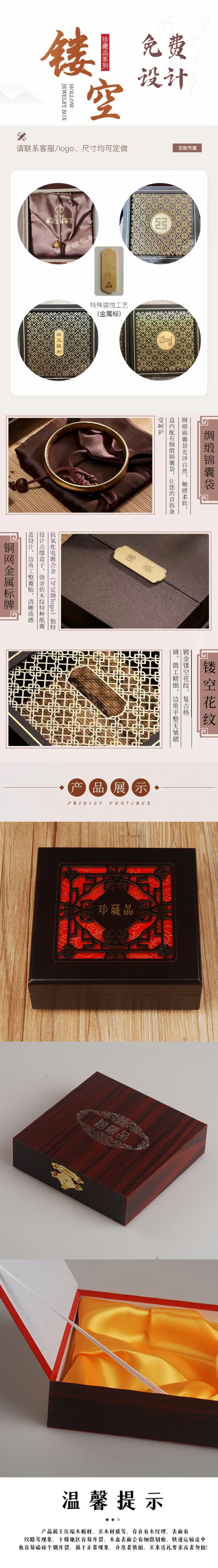 镂空雕刻,盒面有珍藏品字样,字迹清晰多款。高清漆面,材质坚韧细腻,光泽饱满明亮。厂家直接下单定制 尺寸、款式多选。